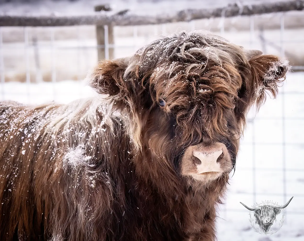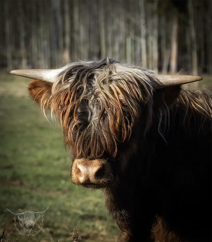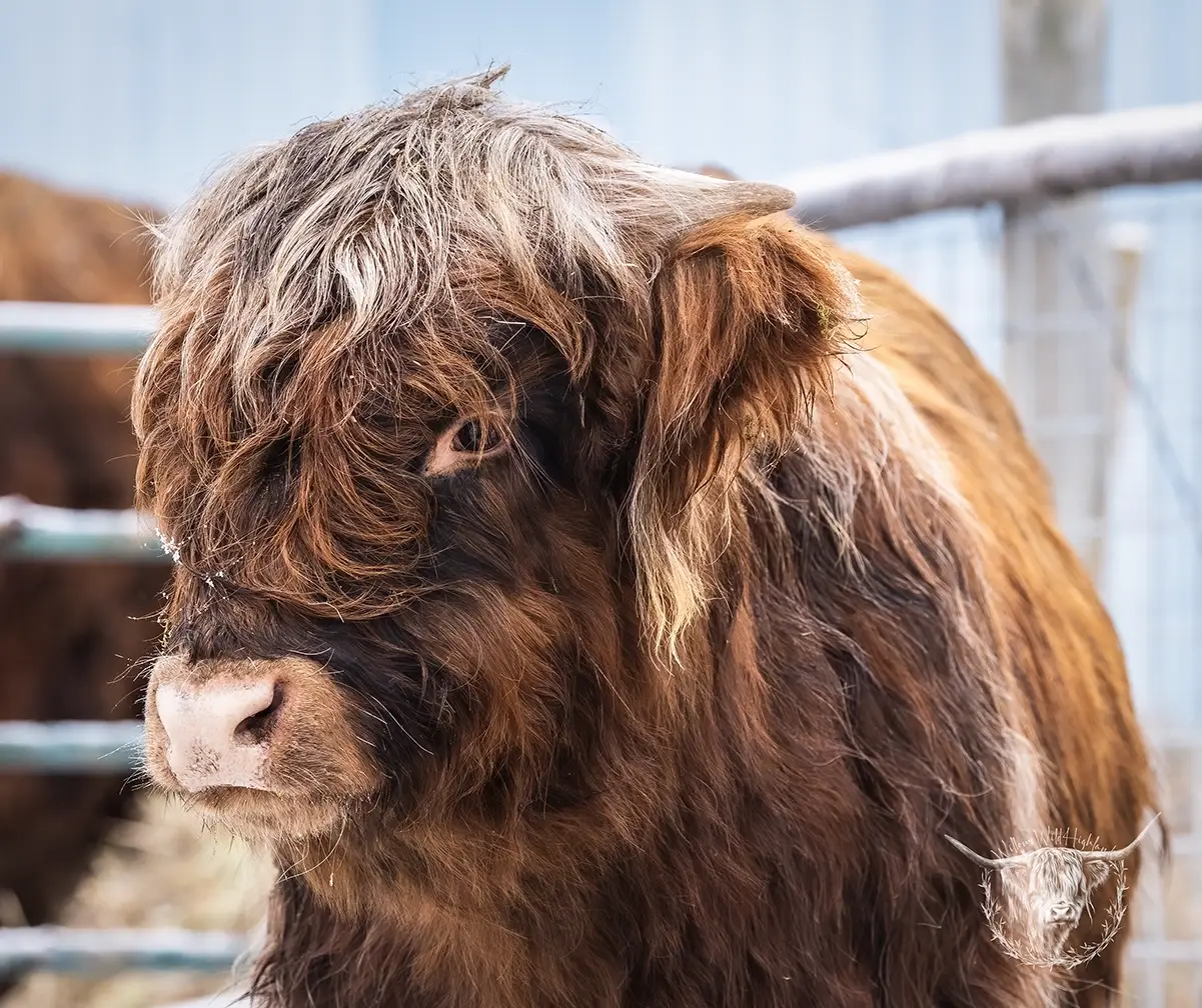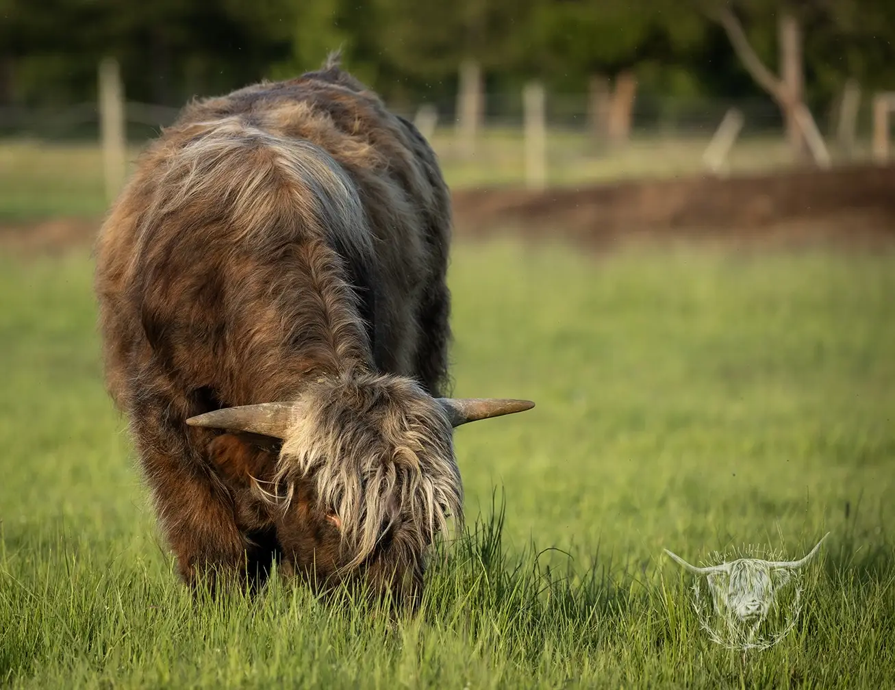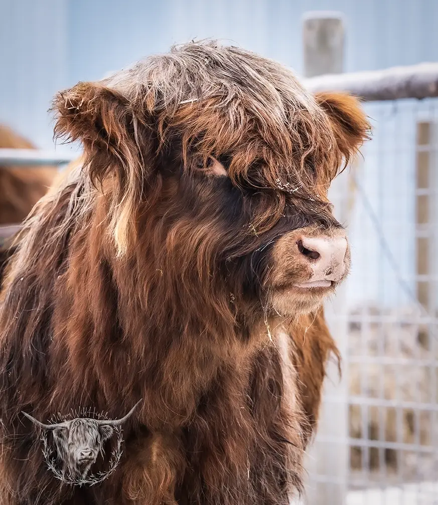 Michael joined the fold winter of 2024. He is a very handsome frosted yellow brindle. He has a solid build and a disposition to match, always ready for a good scratch and an even better combing. He has a couple of calves on the ground and we’re impressed!