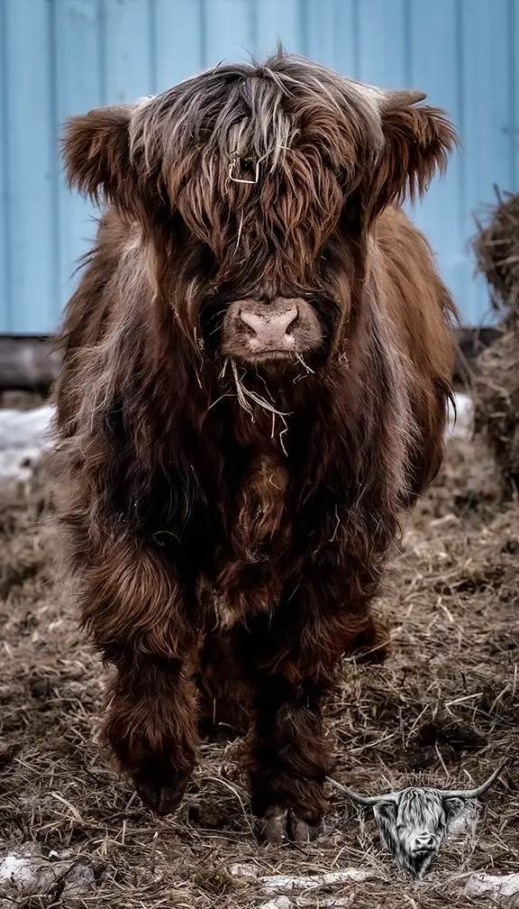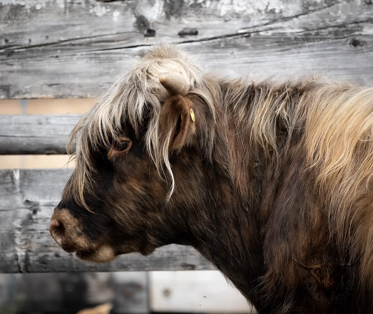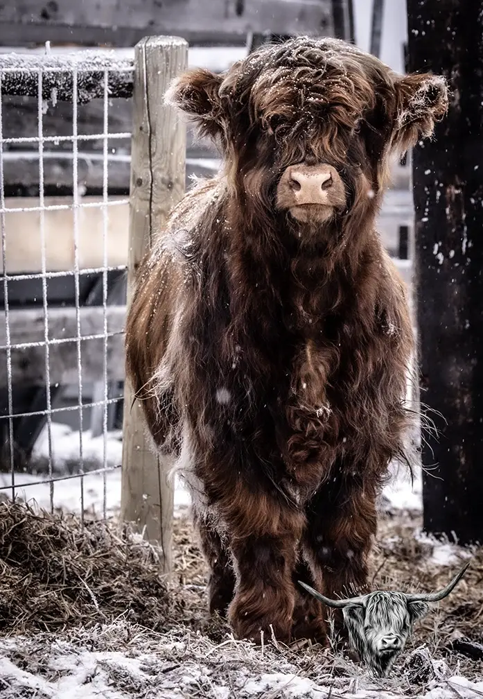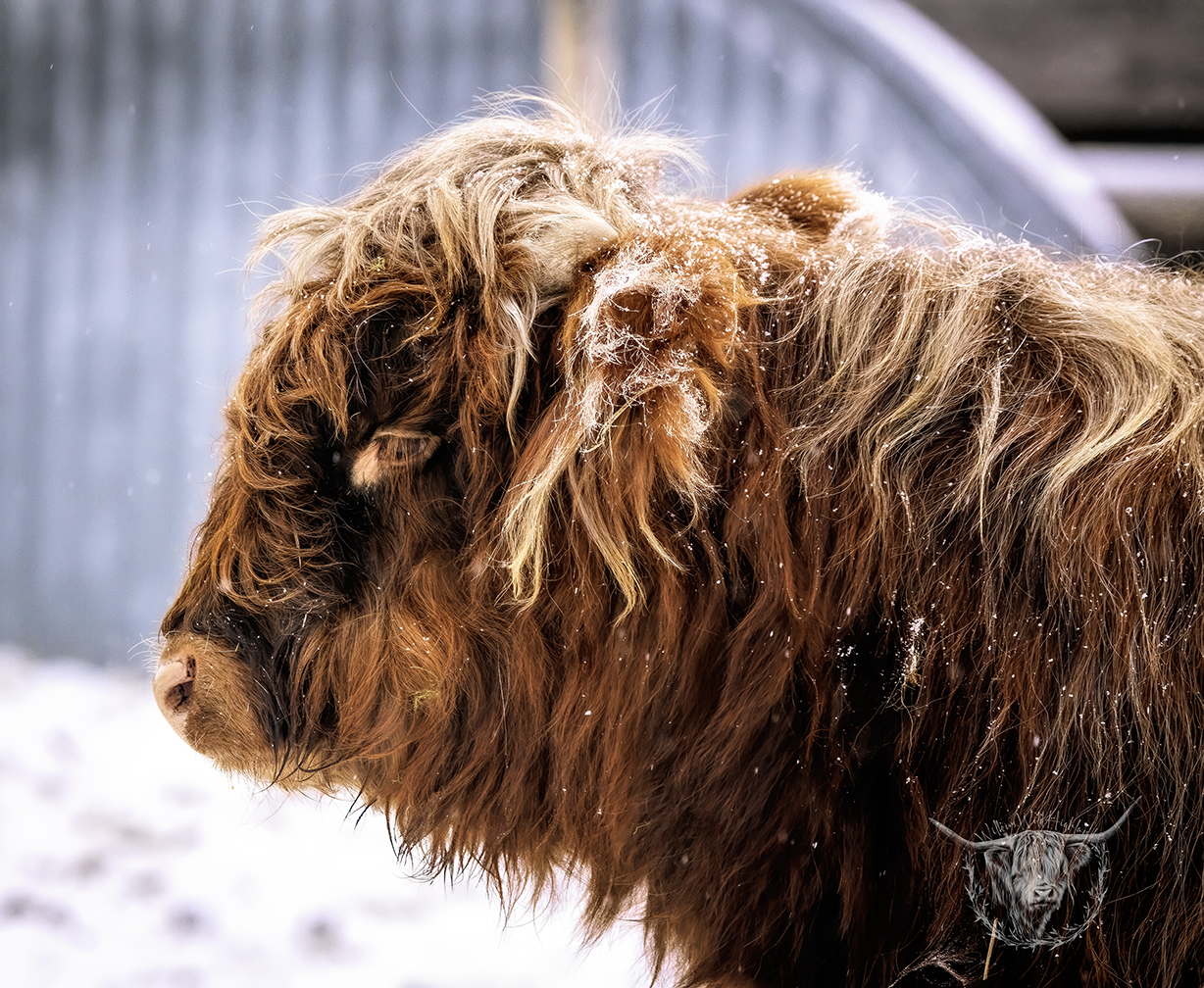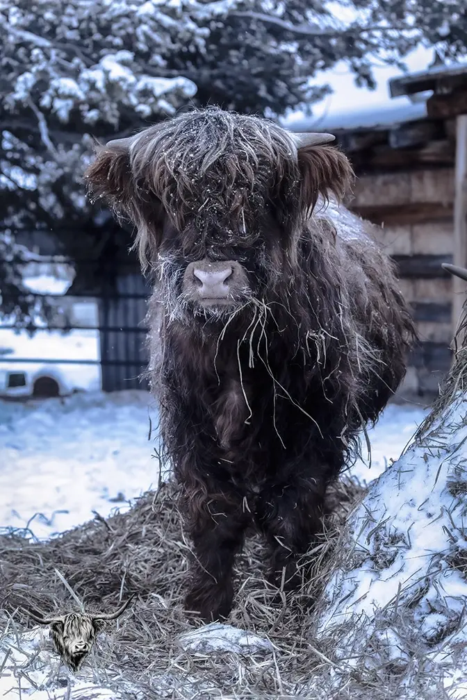 Michael joined the fold winter of 2024. He is a very handsome frosted yellow brindle. He has a solid build and a disposition to match, always ready for a good scratch and an even better combing. He has a couple of calves on the ground and we’re impressed!