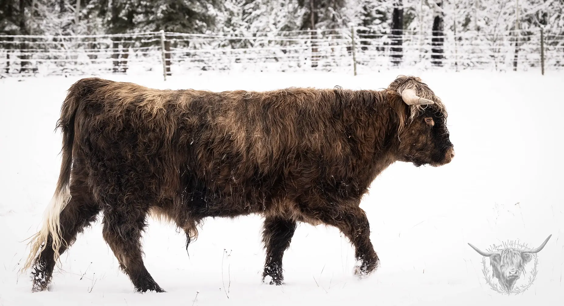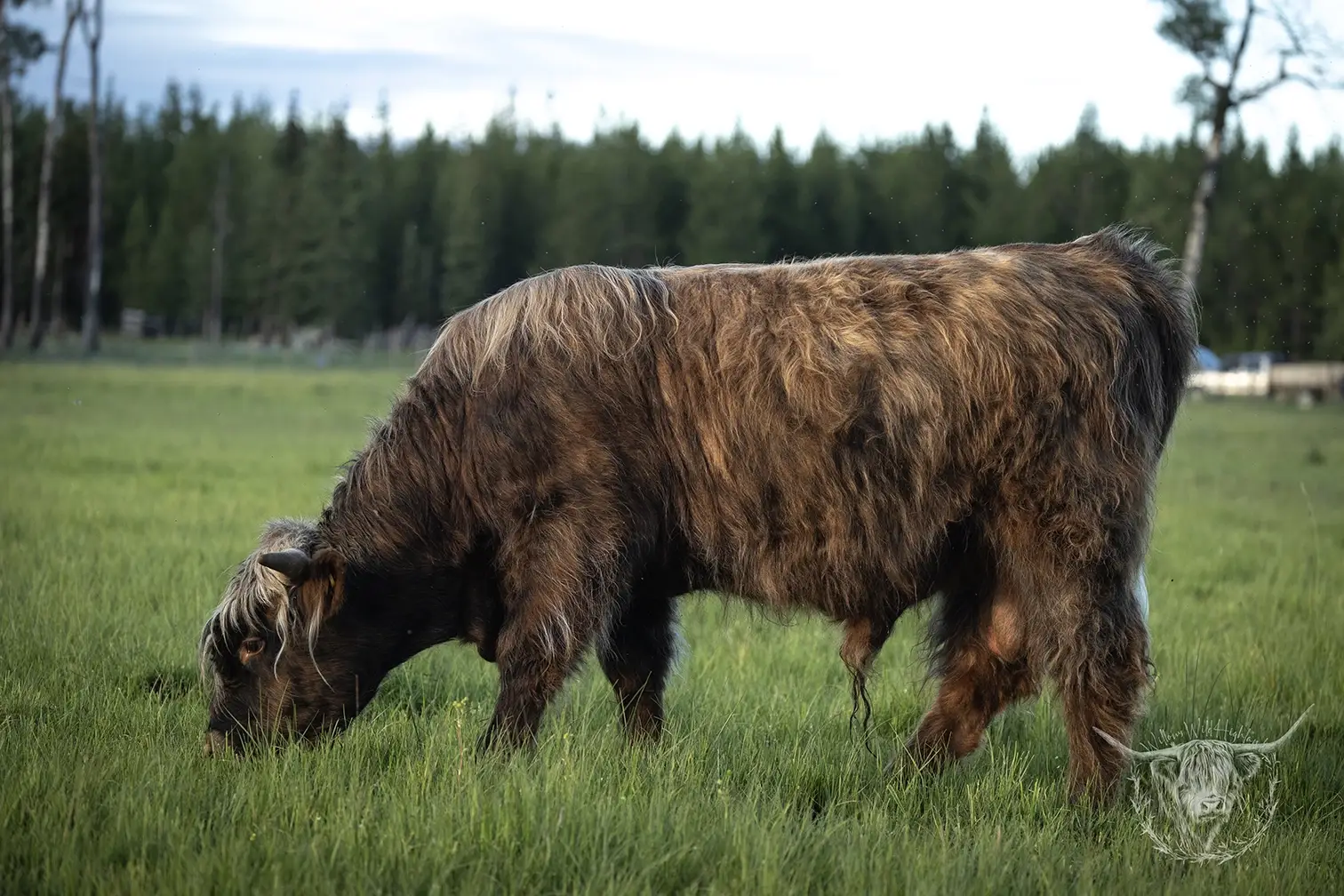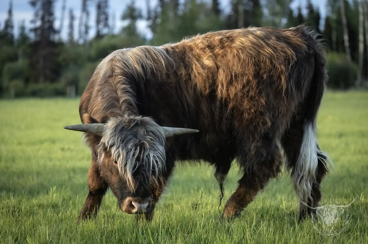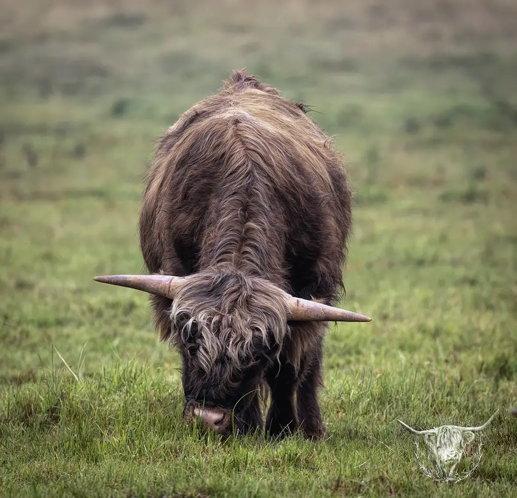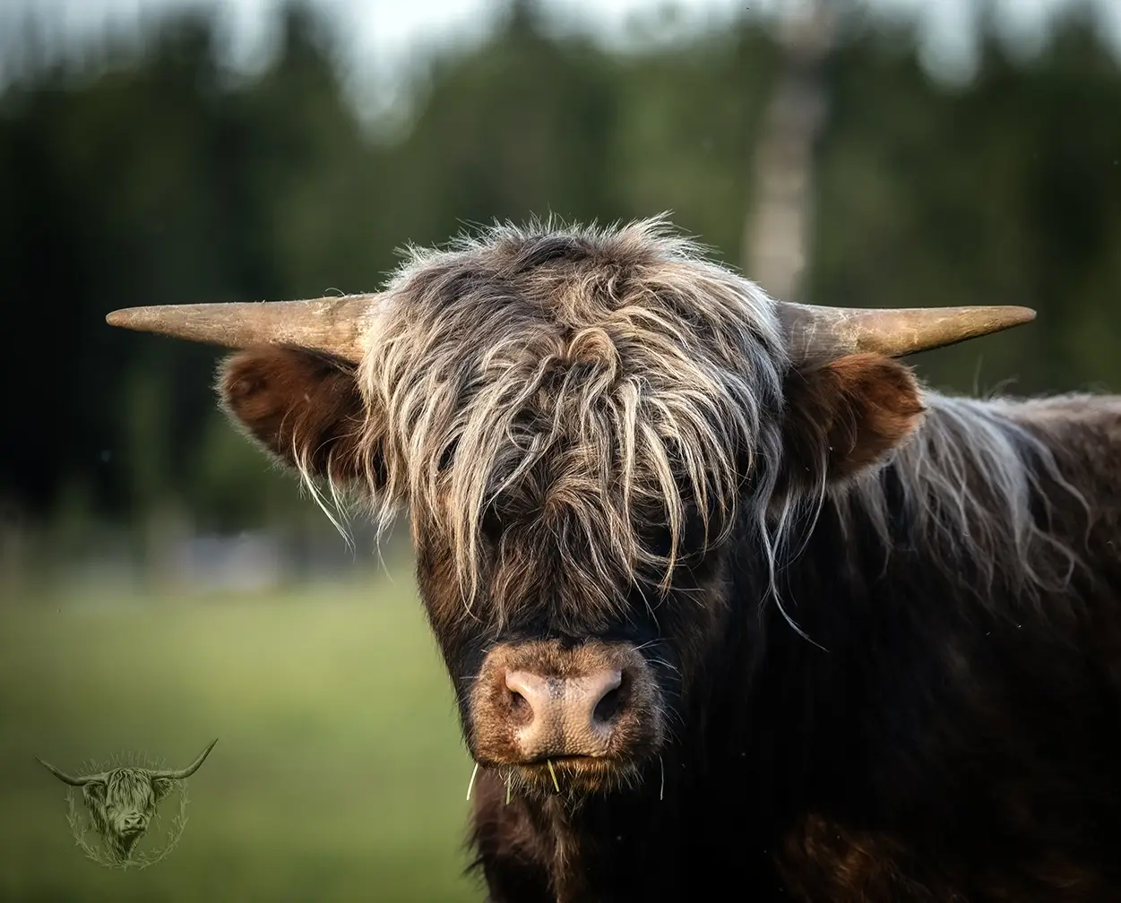 Michael joined the fold winter of 2024. He is a very handsome frosted yellow brindle. He has a solid build and a disposition to match, always ready for a good scratch and an even better combing. He has a couple of calves on the ground and we’re impressed!