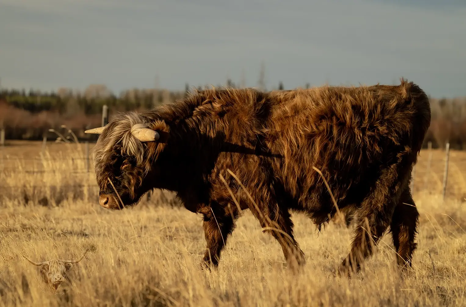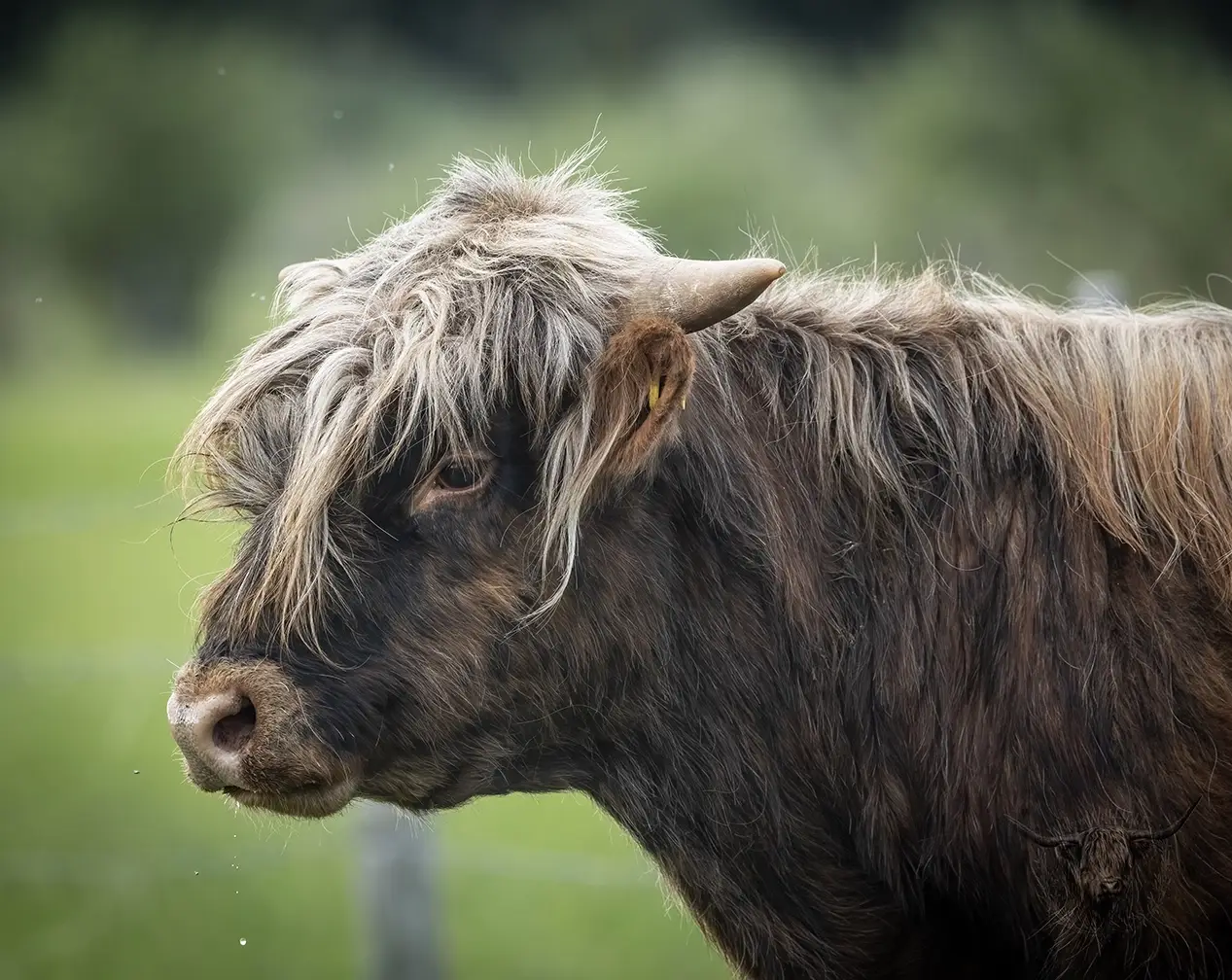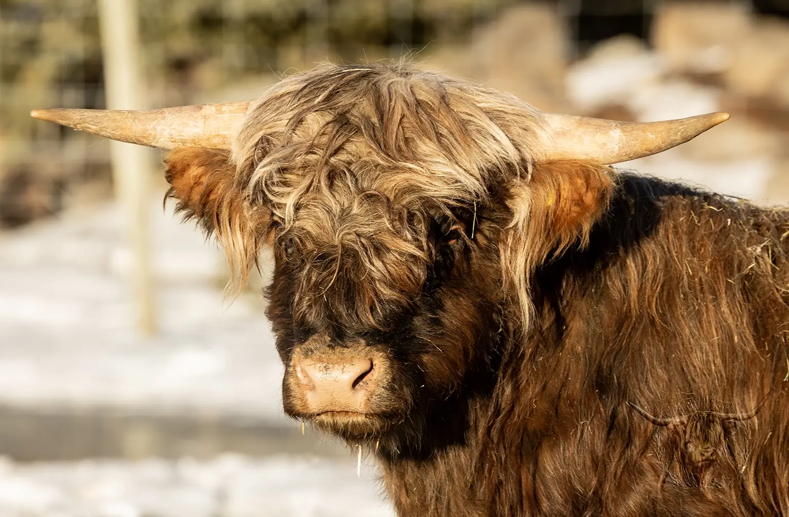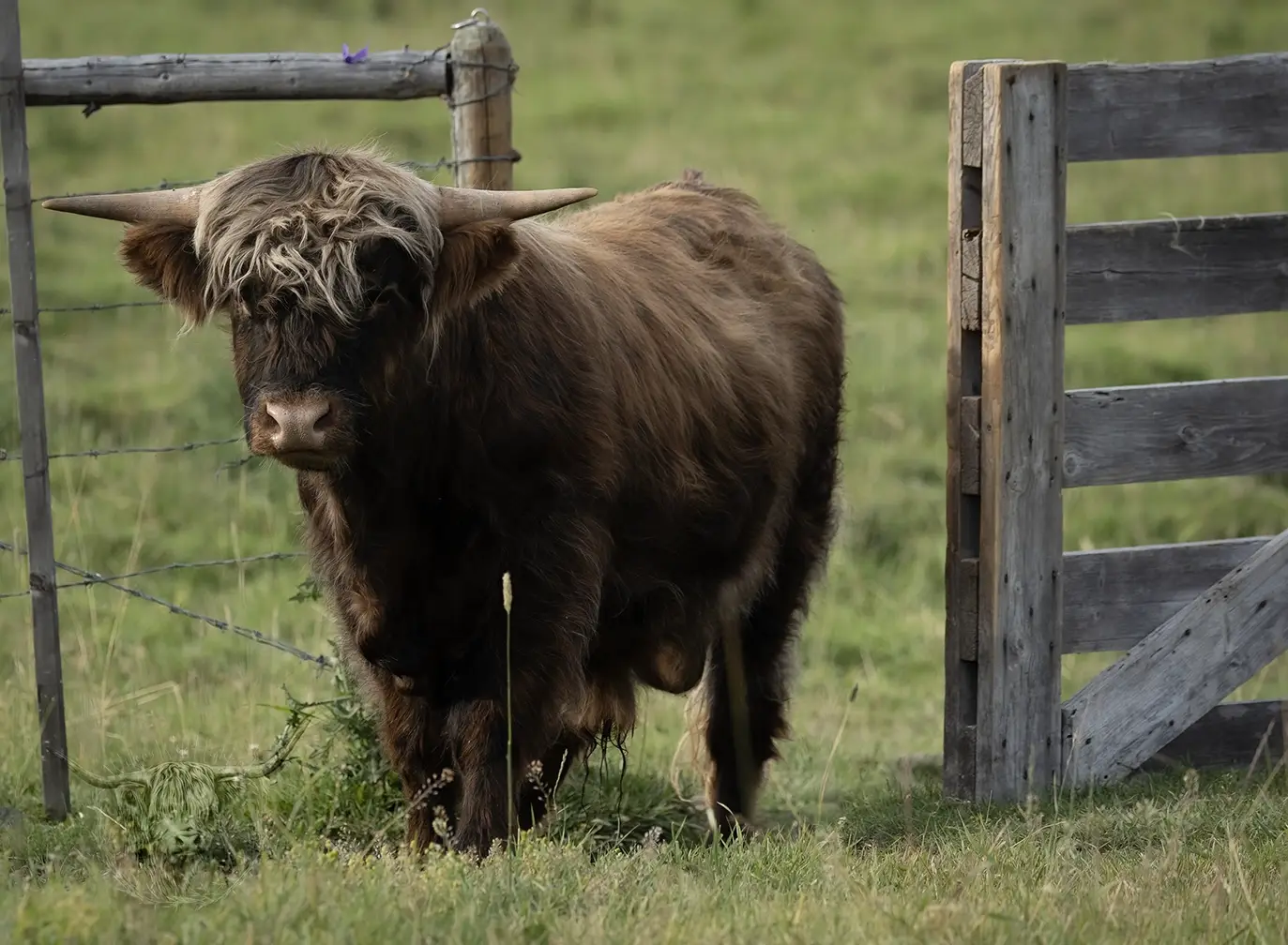 Michael joined the fold winter of 2024. He is a very handsome frosted yellow brindle. He has a solid build and a disposition to match, always ready for a good scratch and an even better combing. He has a couple of calves on the ground and we’re impressed!